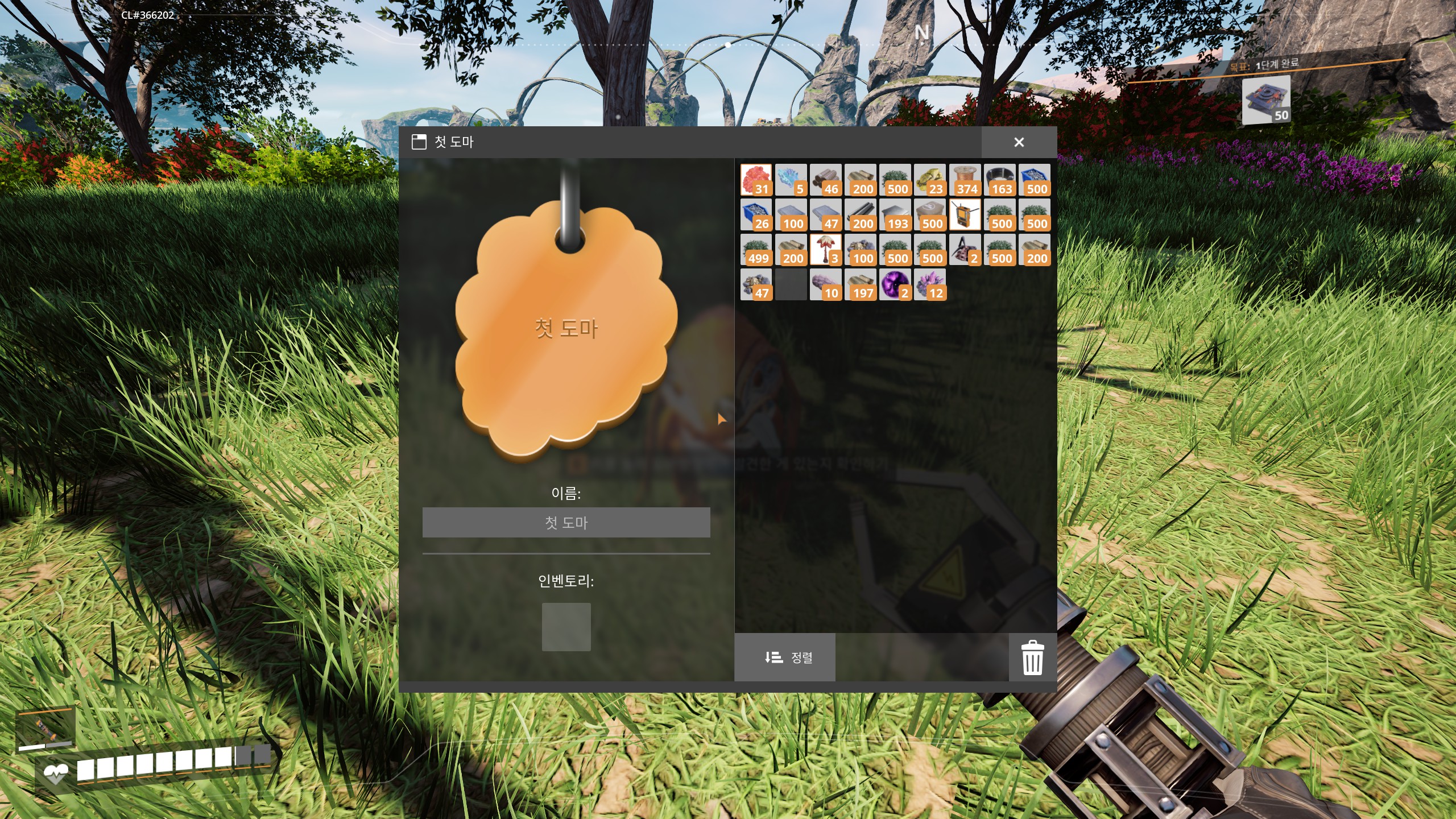 우측 상단에 1단계 완료를 하기 위해서는 기초 자원들이 모아줘야 합니다.
