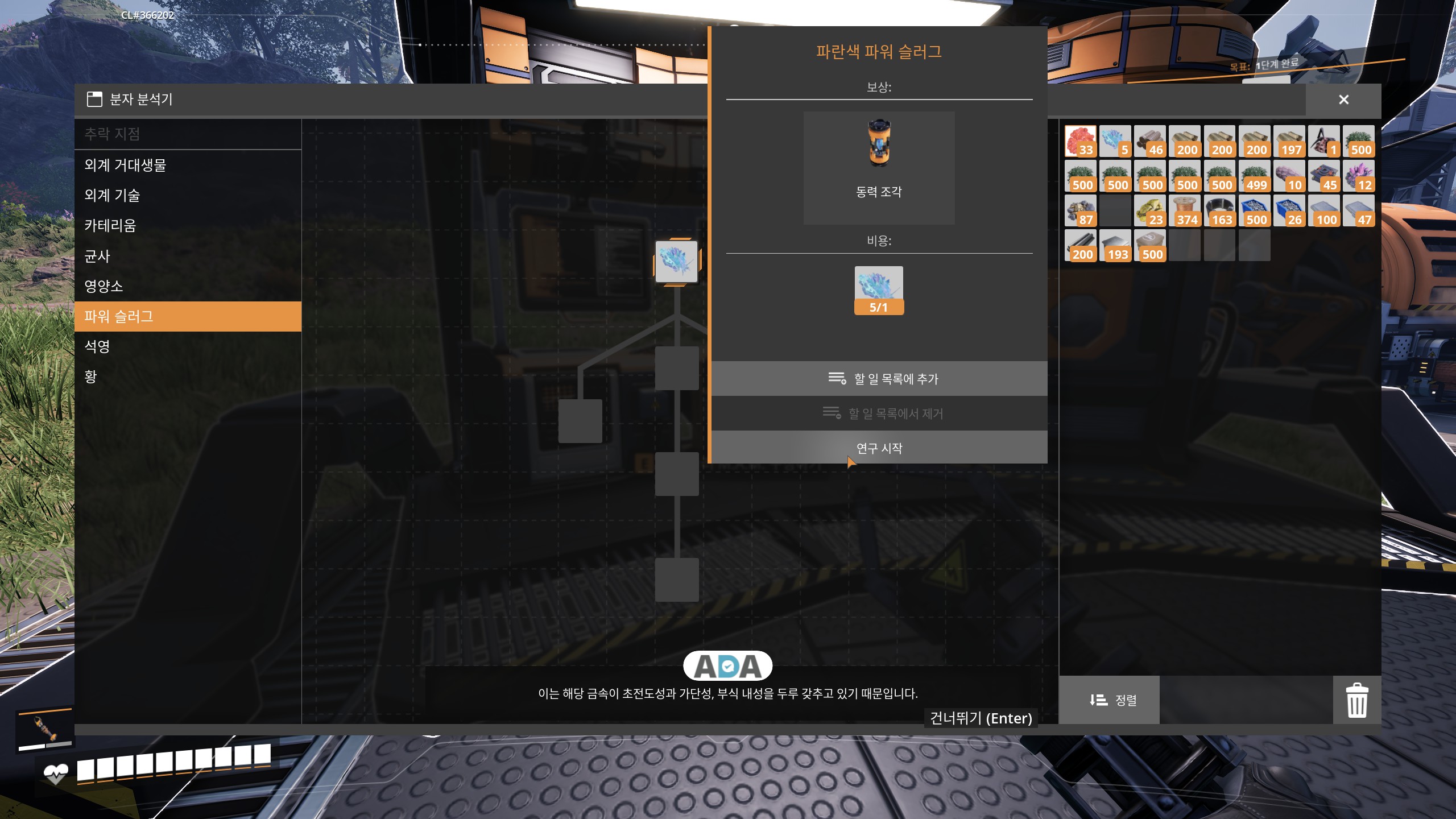 이제 돌아와서 탐사하면서 모았던 자원들을 가지고 연구를 진행해줍니다.